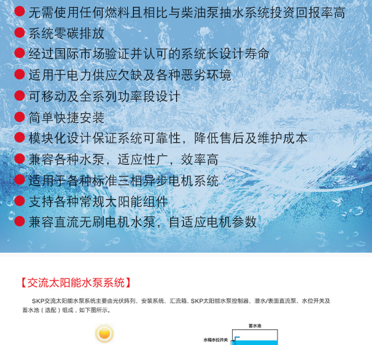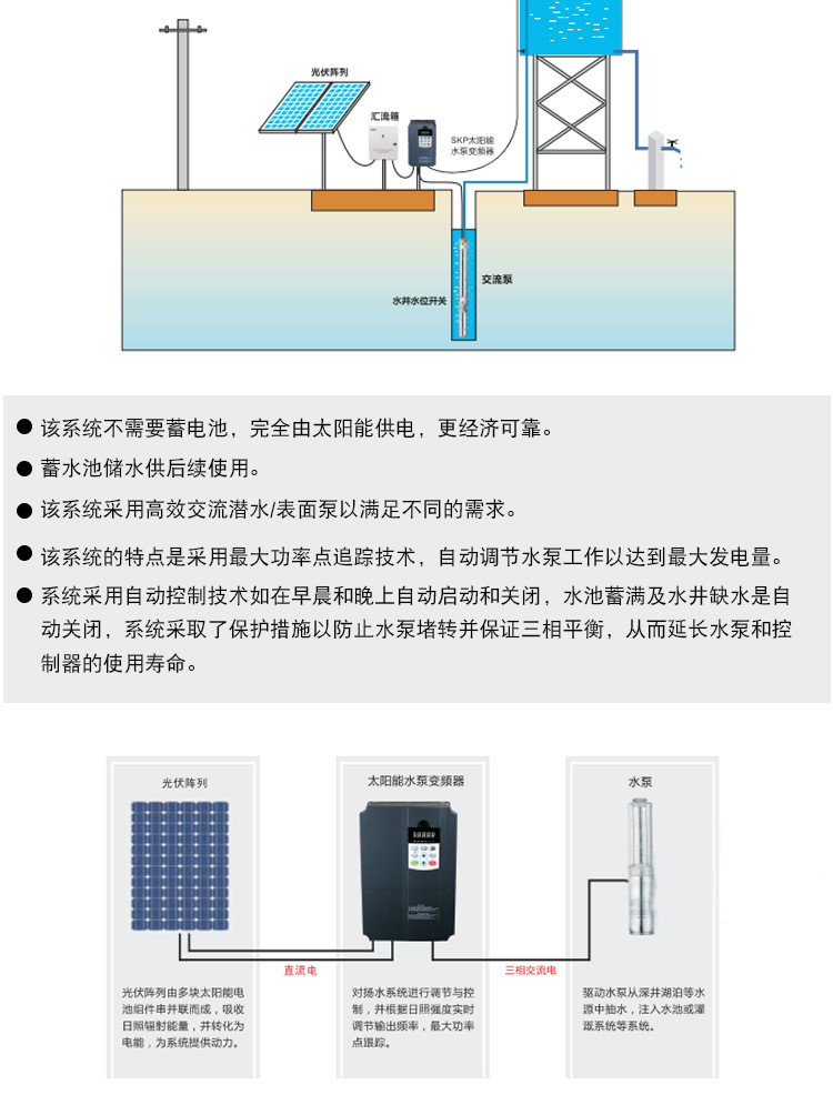應(yīng)用行業(yè):廣泛應(yīng)用于陽光充足、市電短缺的地區(qū),可以解決農(nóng)場灌溉、畜牧養(yǎng)殖、生產(chǎn)生活的用水問題。