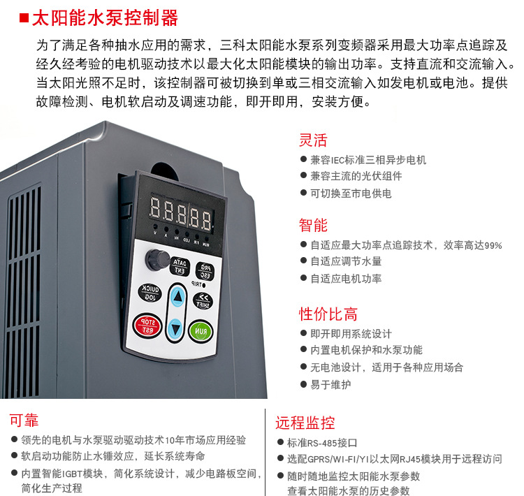 SK650系列變頻器是三科推出的針對(duì)光伏發(fā)電,驅(qū)動(dòng)三相交流水泵的變頻器,它采用大功率點(diǎn)追蹤及久經(jīng)考驗(yàn)的電機(jī)驅(qū)動(dòng)技術(shù)以催化增大太陽能模塊的輸出功率,它將直流電直接逆變成三相交流電,可驅(qū)動(dòng)各類交流水泵。同時(shí)它支持直流和交流輸入,當(dāng)沒有太陽能時(shí),該變頻器手動(dòng)切換到單項(xiàng)或三相交流電輸入,如市電發(fā)電機(jī)或電池。SK650光伏水泵變頻器提供全方位保護(hù),電機(jī)軟啟動(dòng)及調(diào)速功能,即開即用,安裝方便。