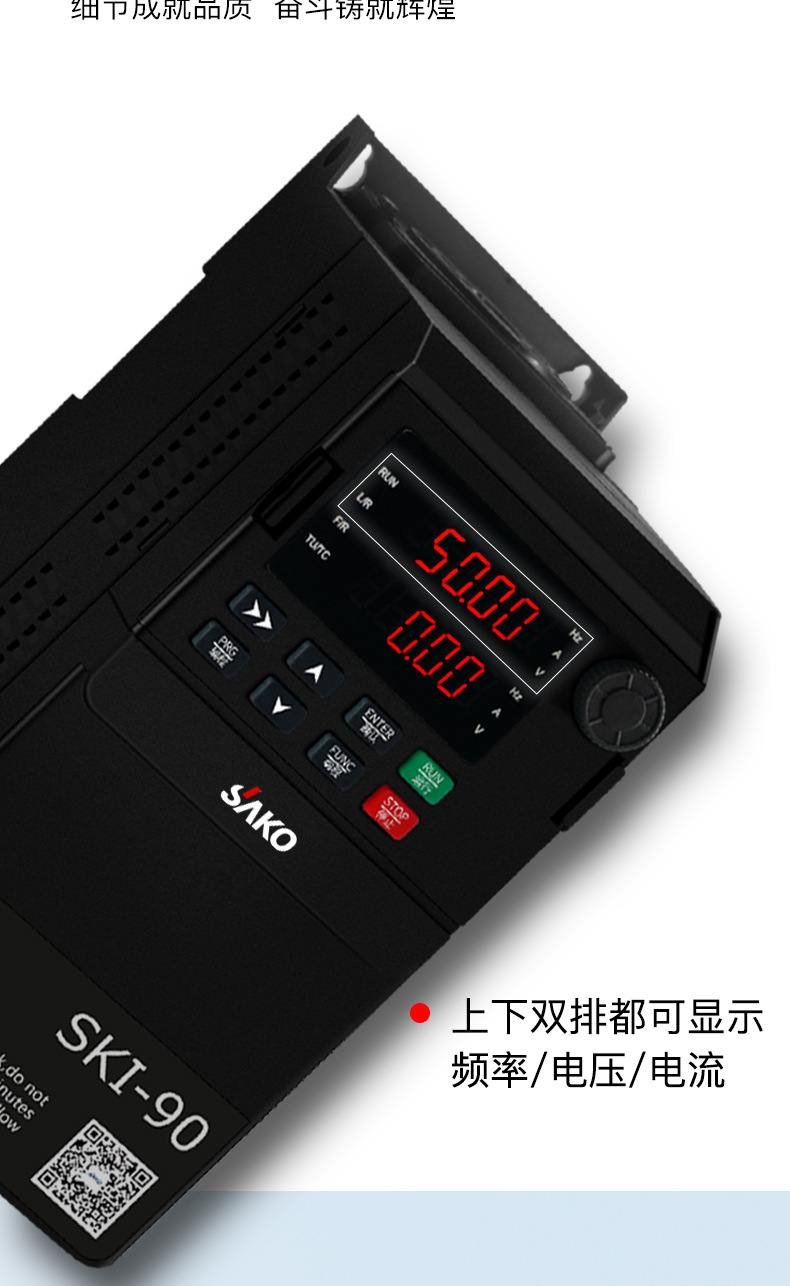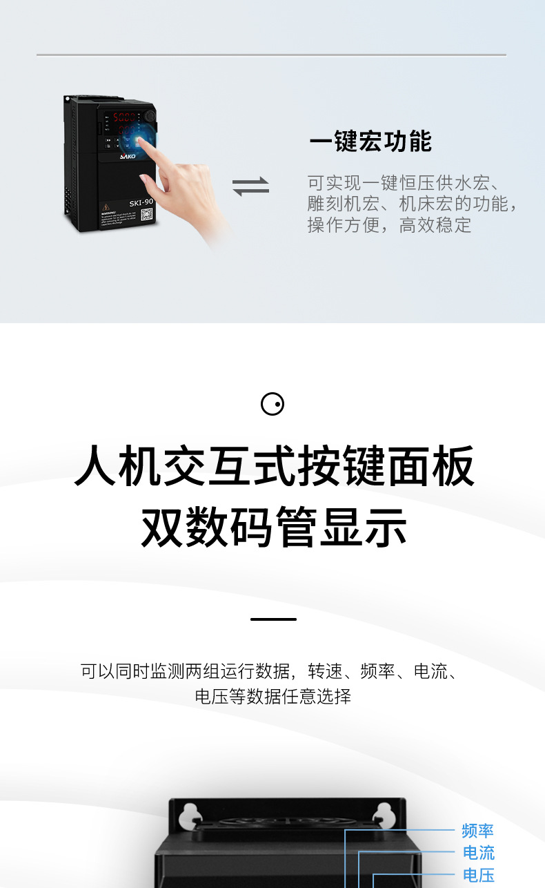模塊機(jī),體積小,功能強(qiáng)大,市面上超過98%的變頻器都可替換使用,纖細(xì)外觀,內(nèi)部全新升級,設(shè)計更緊湊,空間更節(jié)省更節(jié)約安裝空間,增加機(jī)柜里變頻器安裝數(shù)量,有效降低成本,雙排LED超清顯示,面板可外接延長。上下雙排都可顯示頻率,電壓,電流。