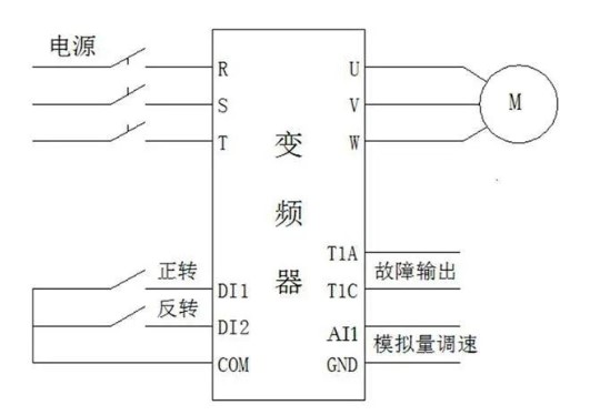 例如一個開關(guān)收到變頻器的正轉(zhuǎn)接線端子(一些是FWD,這兒是DI1),此刻變頻器會正轉(zhuǎn),開關(guān)自然要挑選維持式的,當(dāng)開關(guān)斷掉后,變頻器會立即終止。
