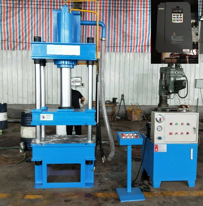 在沖壓設(shè)備行業(yè)中液壓沖床是一種能夠以全自動(dòng)、智能化運(yùn)行的伺服電液復(fù)合壓力機(jī)??蛇m用于拉伸、彎曲、成型、沖裁落料、翻邊等各種沖壓工藝中,該設(shè)備所加工的產(chǎn)品可廣泛的應(yīng)用在汽車零部件、家用電器、廚房用具等諸多領(lǐng)域中。以下能夠是杭州三科所設(shè)計(jì)SKI600系列矢量重載變頻器在一種四柱式液壓沖床上的應(yīng)用方案。