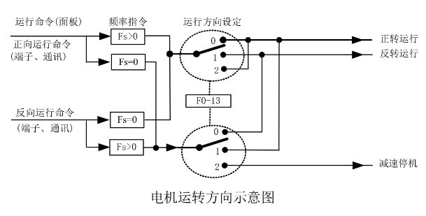 在有的驅(qū)動系統(tǒng)中,只允許系統(tǒng)正轉(zhuǎn)運轉(zhuǎn)而不允許反轉(zhuǎn)運轉(zhuǎn),則需求將F0-13=2,此時若呈現(xiàn)反轉(zhuǎn)指令,則VFD將減速至0并進(jìn)入停機(jī)狀態(tài),同時操作面上FWD/REV不斷閃爍。