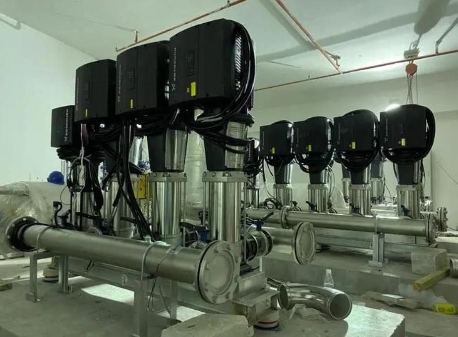 當(dāng)用水量減少時(shí),水泵轉(zhuǎn)速比緩解,減少出水量,使管道網(wǎng)壓力維持設(shè)定壓力值。在多臺(tái)泵運(yùn)行時(shí),逐機(jī)軟啟動(dòng),由變頻轉(zhuǎn)直流電至壓力流量做到截至,完成了水泵的循環(huán)操縱。系統(tǒng)設(shè)定的準(zhǔn)時(shí)換泵操縱功效,可均衡各泵的運(yùn)行時(shí)間和毀壞水準(zhǔn),提升泵組的整體應(yīng)用限期。