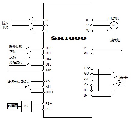 牽引系統(tǒng)主要由觸摸屏、PLC和SKI600系列變頻器組成。在通過(guò)SKI600完成閉環(huán)矢量模式控制的同時(shí),與PLC之間進(jìn)行高速通訊來(lái)實(shí)現(xiàn)轉(zhuǎn)速模式和轉(zhuǎn)矩模式的切換以及允許頻率和電流等數(shù)據(jù)的交換。