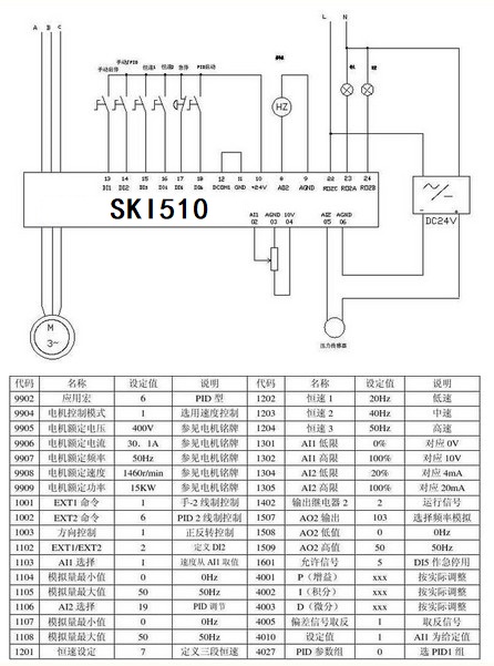 一,設(shè)計(jì)思路:選用一臺(tái) 15KW 具有 PID 功能的變頻器,可以不考慮輸入電抗器,電機(jī)速度由設(shè)定頻率與泵出口壓力作比較進(jìn)行 PID 調(diào)節(jié),設(shè)計(jì)應(yīng)考慮能手 /自動(dòng)轉(zhuǎn)換。