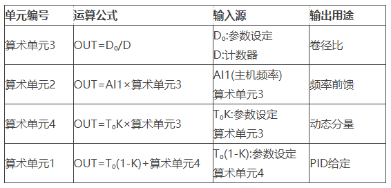 graph TD A[主機(jī)頻率F0] --> B[算術(shù)單元2] C[實時卷徑D] --> D[算術(shù)單元3] D -->|D0/D| B B --> E[頻率前饋] F[張力設(shè)定T0] --> G[算術(shù)單元1] H[錐度系數(shù)K] --> G D --> I[算術(shù)單元4] I --> G E --> J[頻率合成] G --> K[PID控制器] L[張力反饋] --> K K --> J J --> M[收卷電機(jī)]