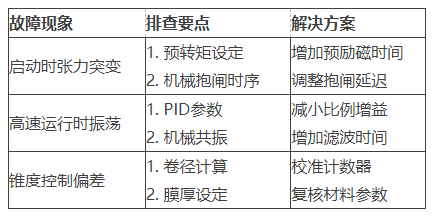 建議每6個月進(jìn)行一次系統(tǒng)校準(zhǔn),包括張力傳感器標(biāo)定、卷徑計算驗證等維護(hù)項目。對于特殊材料(如超薄膜、彈性基材等),需重新優(yōu)化錐度系數(shù)和PID參數(shù)。