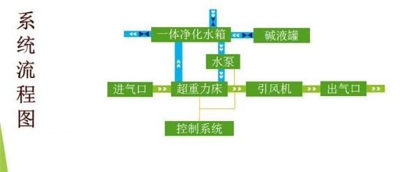 工作原理圖中:綠色箭頭代表廢氣走向,藍色箭頭代表水路線,細線代表控制線