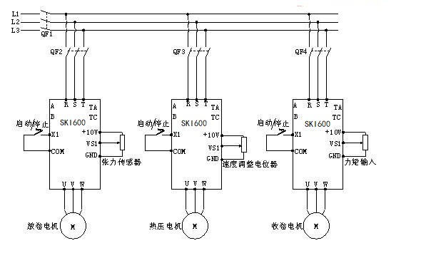 該放卷部分一共有三種材料,兩層無紡布中間夾一層熱熔膠薄膜,均采用杭州三科的SKI600系列的復(fù)合機變頻器作動力放線,利用張力輥反饋回來的0~10V信號與給定量信號作雙向PID運算,PID給定由外部電位器實現(xiàn),其中張力輥的配重由氣壓實現(xiàn)以適應(yīng)不同材料不同張力的要求。放卷時要保證放卷輥與熱壓輥之間的材料張力基本一致否則容易出現(xiàn)材料褶皺。同時利用反饋信號保證SKI600在無材料或者材料斷線的情況下