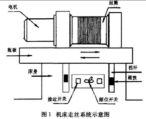 高速線切割機(jī)走絲機(jī)構(gòu)是影響其加工質(zhì)量和加工穩(wěn)定性的關(guān)鍵部件。送絲機(jī)構(gòu)的作用是驅(qū)動電極絲以一定的線速度前后移動,將電極絲整齊地排列在儲線筒上。儲線筒本身的高速正反轉(zhuǎn)是通過電機(jī)的正反轉(zhuǎn)來實現(xiàn)的。電機(jī)通過聯(lián)軸器帶動螺桿筒,再通過同步帶帶動螺桿轉(zhuǎn)動,使滑架往復(fù)運動,通過調(diào)節(jié)換向左右保險杠之間的距離,即可實現(xiàn)滑架的移動行程。機(jī)床的送絲機(jī)構(gòu)如下所示。