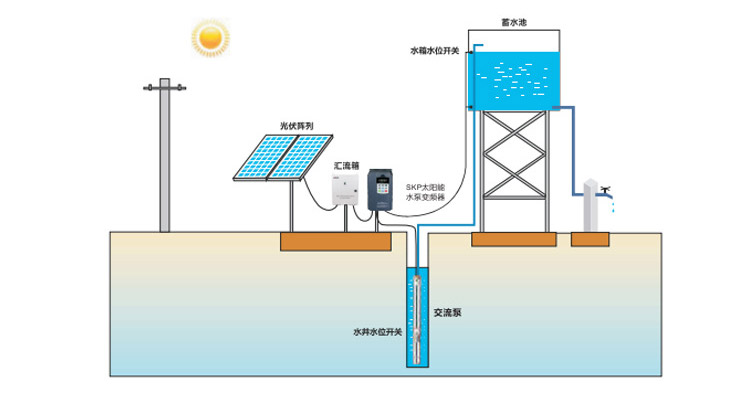 在當(dāng)前社會(huì)環(huán)境中,使用太陽(yáng)能水泵系統(tǒng)的主要目標(biāo),是旨在為沒有電力供應(yīng)或電力短缺的偏遠(yuǎn)地區(qū)提優(yōu)質(zhì)節(jié)能的供水解決方案。該系統(tǒng)利用光伏陣列輸出的直流電來(lái)驅(qū)動(dòng)水泵抽水。該系統(tǒng)無(wú)需安裝電池,但可以將水儲(chǔ)存在儲(chǔ)水罐中以備后續(xù)使用。儲(chǔ)水的水源可以是河流、湖泊、地下水等天然水源,也可以是其他水源。