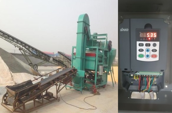 用工頻直接起動,電機能以最快速度到達工頻,篩體不容易產(chǎn)生機械碰撞甚至跳出軌道的情況。變頻器起動要想達到接近直接起動的效果,需要加速時間很短,這時起動電流會增加,因此,變頻器選型時要注意,需要加大兩檔選型,這樣可以避免起動過程中出現(xiàn)過電流報警的現(xiàn)象,同時,也可以保證設備安全穩(wěn)定運行。根據(jù)設備的使用情況,我們?yōu)槊颗_設備配套使用了一臺SKI600變頻器。