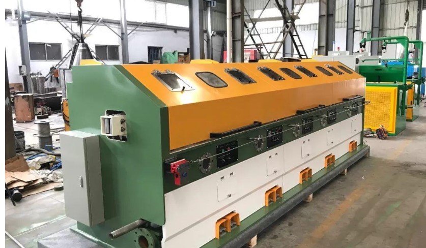 水箱式拉絲機(jī)是由多個(gè)拉拔頭組成的小型連續(xù)生產(chǎn)設(shè)備,通過(guò)逐級(jí)拉拔,并將拉拔頭置于水箱中,最后將鋼絲拉到所需的規(guī)格。就國(guó)內(nèi)幾個(gè)主要水箱式拉絲機(jī)生產(chǎn)商來(lái)看,一般配置了20個(gè)左右的拉拔頭。通過(guò)每一級(jí)的拉拔后,鋼絲的線徑發(fā)生了變化,所以每個(gè)拉拔頭工作線速度也應(yīng)有變化。在整個(gè)拉拔過(guò)程中,只需要1臺(tái)電動(dòng)機(jī)通過(guò)機(jī)械傳動(dòng)或齒輪箱來(lái)驅(qū)動(dòng)。根據(jù)拉模配置的不同,各個(gè)拉拔頭的拉拔速度也要變化。拉拔速度的基準(zhǔn)是每個(gè)時(shí)刻通過(guò)拉模的鋼絲的秒流量體積不變,即要使下式成立
