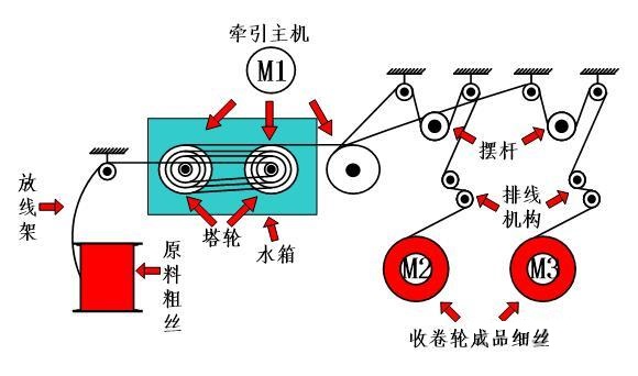 水箱式拉絲機(jī)的各個(gè)拉拔頭的工作速度就是基于以上的公式,保證各個(gè)拉拔頭同步運(yùn)行。由于水箱式拉絲機(jī)的拉絲過(guò)程完全通過(guò)機(jī)械軸拉拔完成,并且這些機(jī)械軸是在同一主軸下傳動(dòng)的,因此整個(gè)拉伸系統(tǒng)各級(jí)之間依靠拉伸輪的轉(zhuǎn)速差別和線上張力來(lái)控制同步協(xié)調(diào)工作。工作時(shí)需要冷卻液進(jìn)行散熱。收線部分用1臺(tái)小功率電動(dòng)機(jī)拖動(dòng),需要保持收卷時(shí)線上張力保持恒定,若這一段張力波動(dòng),收卷的工字輪上的繞線將會(huì)不均勻。水箱式拉絲機(jī)的收卷環(huán)節(jié)是此設(shè)備控制系統(tǒng)中的核心環(huán)節(jié),該環(huán)節(jié)也直接影響著鋼絲的質(zhì)量。