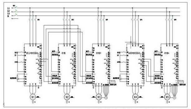 目前行業(yè)常用的方案:卷繞張力由磁粉離合器或力矩電機(jī)控制,第一、二次放卷張力由磁粉制動器控制。烘爐段的張力控制主要是通過浮動輥電位器檢測速度偏差,通過電位器或通過同步控制板手動調(diào)節(jié)復(fù)合電機(jī)和涂膠電機(jī)的速度同步來維持恒定的張力。